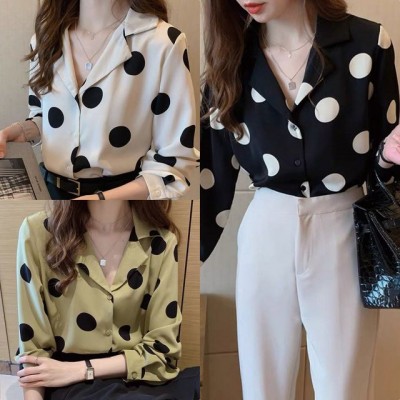 V넥 루즈핏 도트무늬 블라우스 셔츠